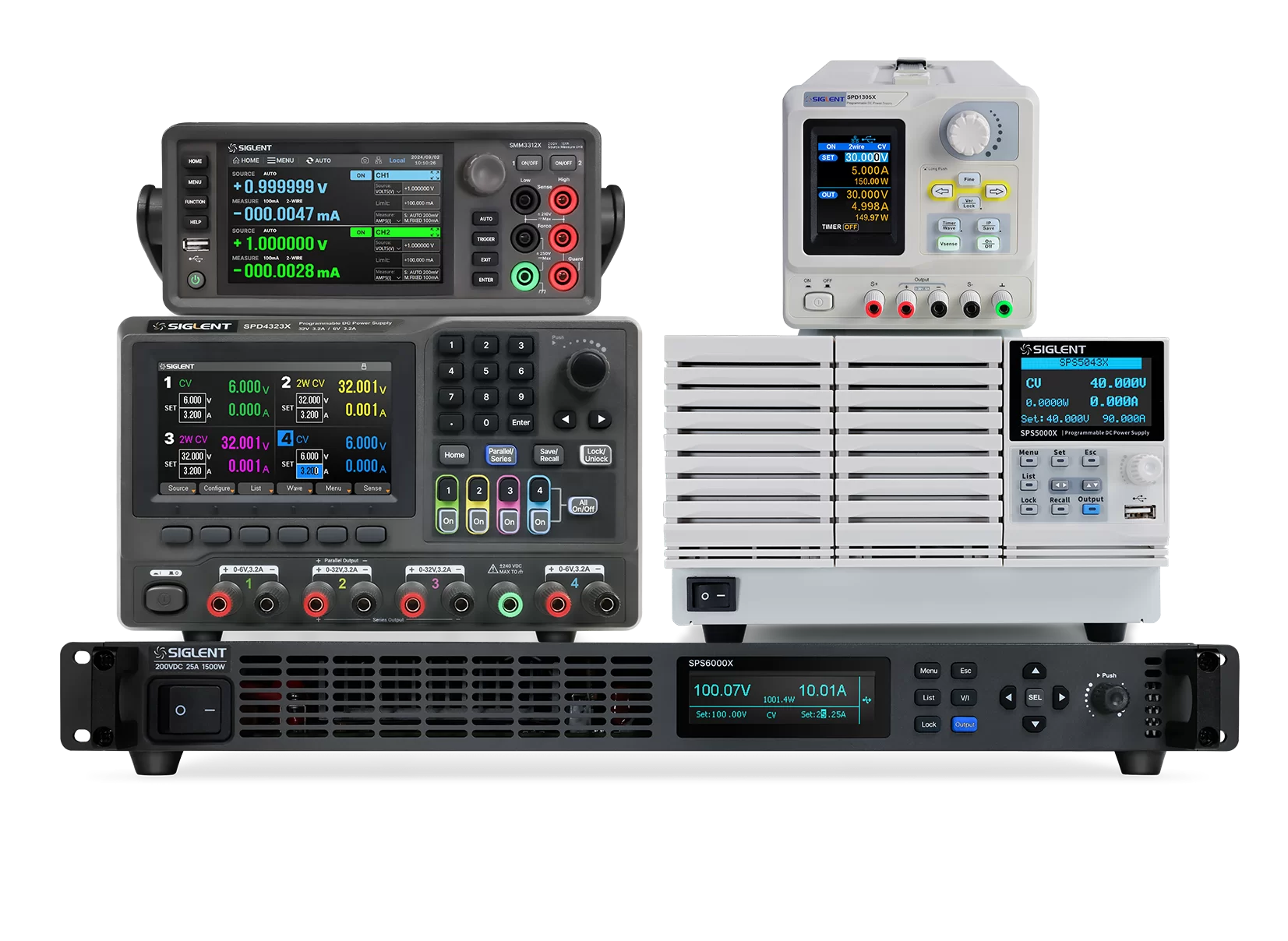 Siglent DC power supply support independent, series and parallel output modes, panel programming, timed output and remote control. The SMU series integrates current source, voltage source, voltmeter and ammeter functions, supports four-quadrant operation, and meets diverse demands for high-precision testing.